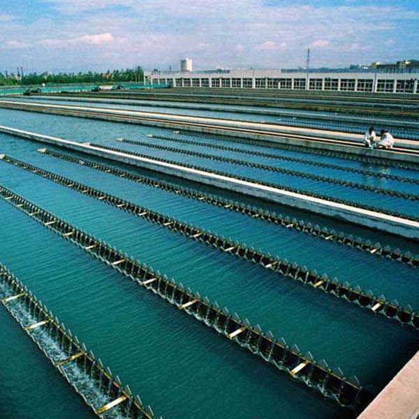 絮凝后出水进入沉淀池的斜板底部然后上向流至上部集水区,?颗粒和絮体沉淀在斜板的表面上并在重力作用下下滑。较高的上升流速和斜板?60°倾斜可以形成一个连续自刮的过程,使絮体不会积累在斜板上。污泥沿斜板表面下滑并沉淀在沉淀池底部,?然后循环泵把部分污泥输送到混凝和絮凝池中,剩余污泥通过重力流流向污泥处理系统。沉淀后的水由分布在斜板沉淀池顶部的不锈钢集水槽收集、排放。?